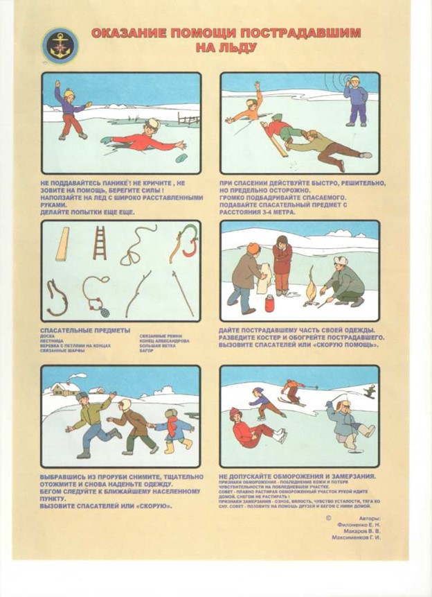 Если под рукой имеются доски, лестницы, шесты и другие предметы, то их надо использовать для оказания помощи. Лежа на одном из таких предметов, закрепленном веревкой на берегу или твердом льду, оказывающий помощь продвигается к пострадавшему на расстояние, позволяющее подать веревку, пояс, багор, доску. Затем, оказывающий помощь отползает назад и постепенно вытаскивает пострадавшего на крепкий лед. Если оказывающий помощь не имеет спасательного пояса, то он должен обвязаться веревкой, предварительно закрепив ее на берегу или в лунке твердого льда. При оказании помощи, когда есть промоины или битый лед, используются специальные спасательные шлюпки или шлюпки на съемных полозьях. Для продвижения шлюпки вперед используются кошки и багры. Но могут быть и такие случаи, когда нет никаких подручных предметов для оказания помощи. В этом случае два-три человека ложатся на лед и цепочкой продвигаются к пострадавшему, удерживая друг друга за ноги, а первый подает пострадавшему ремень, одежду и т.п.